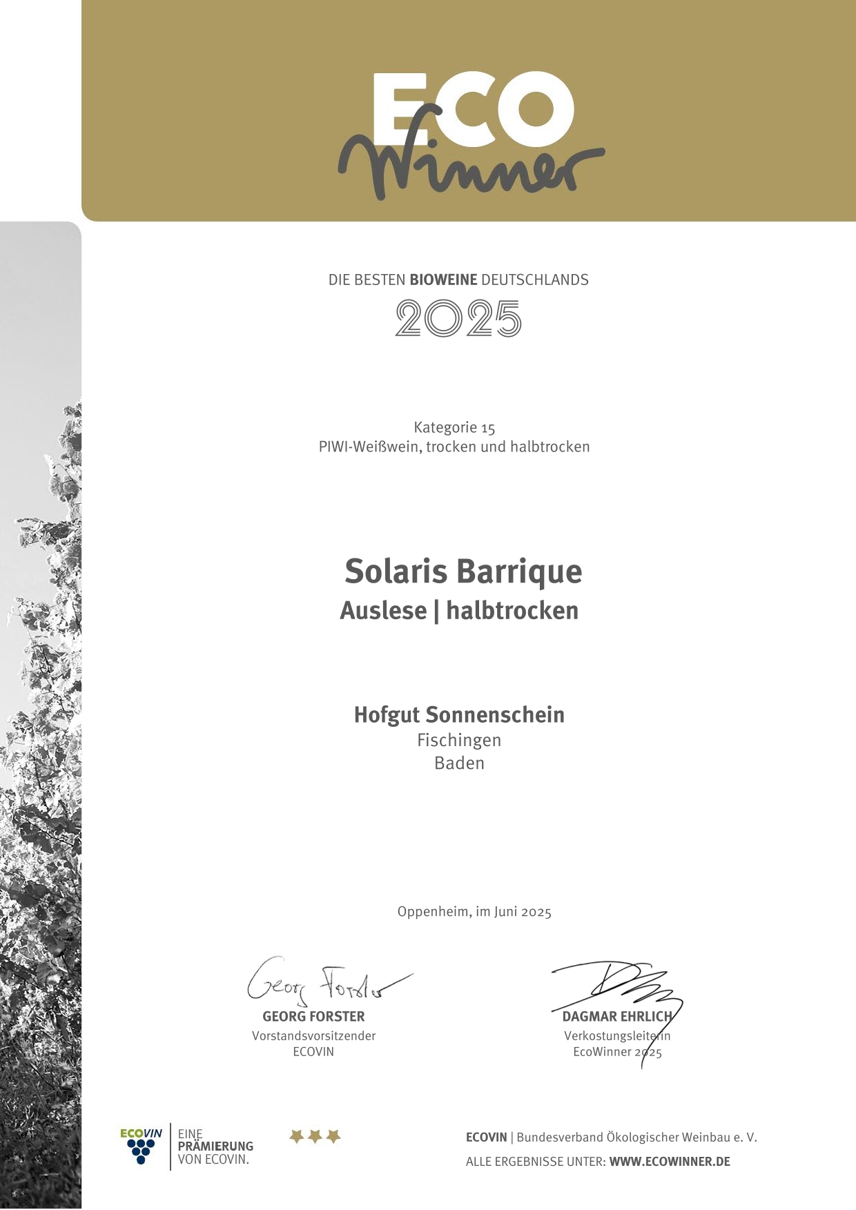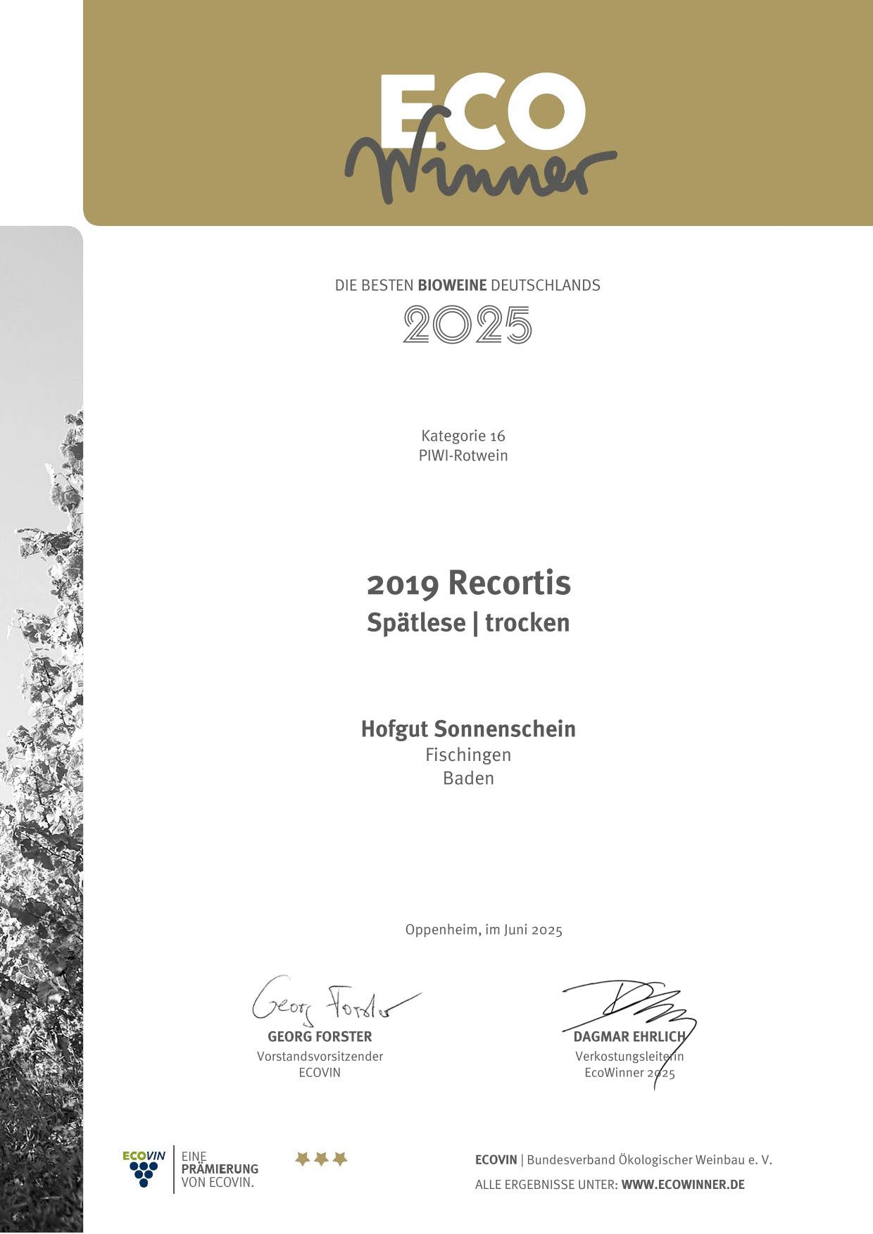 🎉 EcoWinner 2025 – Zwei Siegerweine vom Hofgut Sonnenschein! 🍷